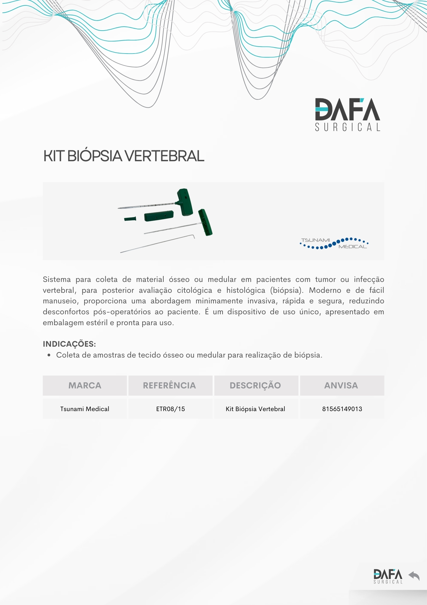 Sistema para coleta de material ósseo ou medular em pacientes com tumor ou infecção vertebral, para posterior avaliação citológica e histológica (biópsia). Moderno e de fácil manuseio, proporciona uma abordagem minimamente invasiva, rápida e segura, reduzindo desconfortos pós-operatórios ao paciente. É um dispositivo de uso único, apresentado em embalagem estéril e pronta para uso.