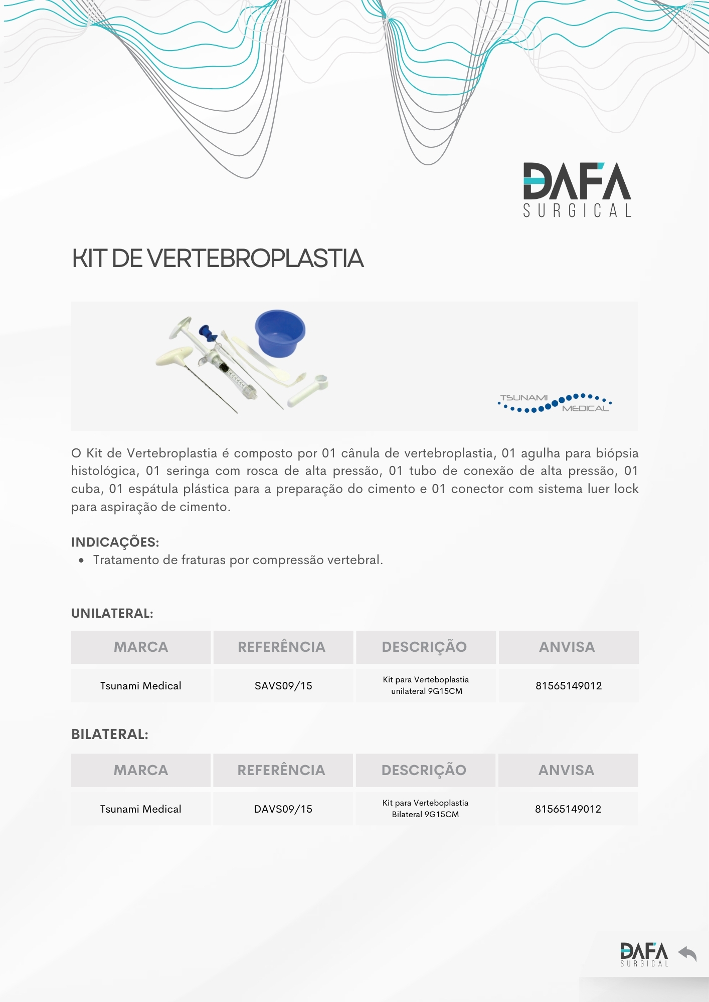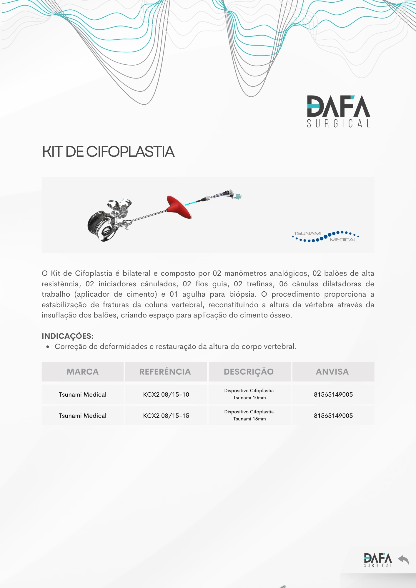 O Kit de Cifoplastia é bilateral e composto por 02 manômetros analógicos, 02 balões de alta resistência, 02 iniciadores cânulados, 02 fios guia, 02 trefinas, 06 cânulas dilatadoras de trabalho (aplicador de cimento) e 01 agulha para biópsia. O procedimento proporciona a estabilização de fraturas da coluna vertebral, reconstituindo a altura da vértebra através da insuflação dos balões, criando espaço para aplicação do cimento ósseo.