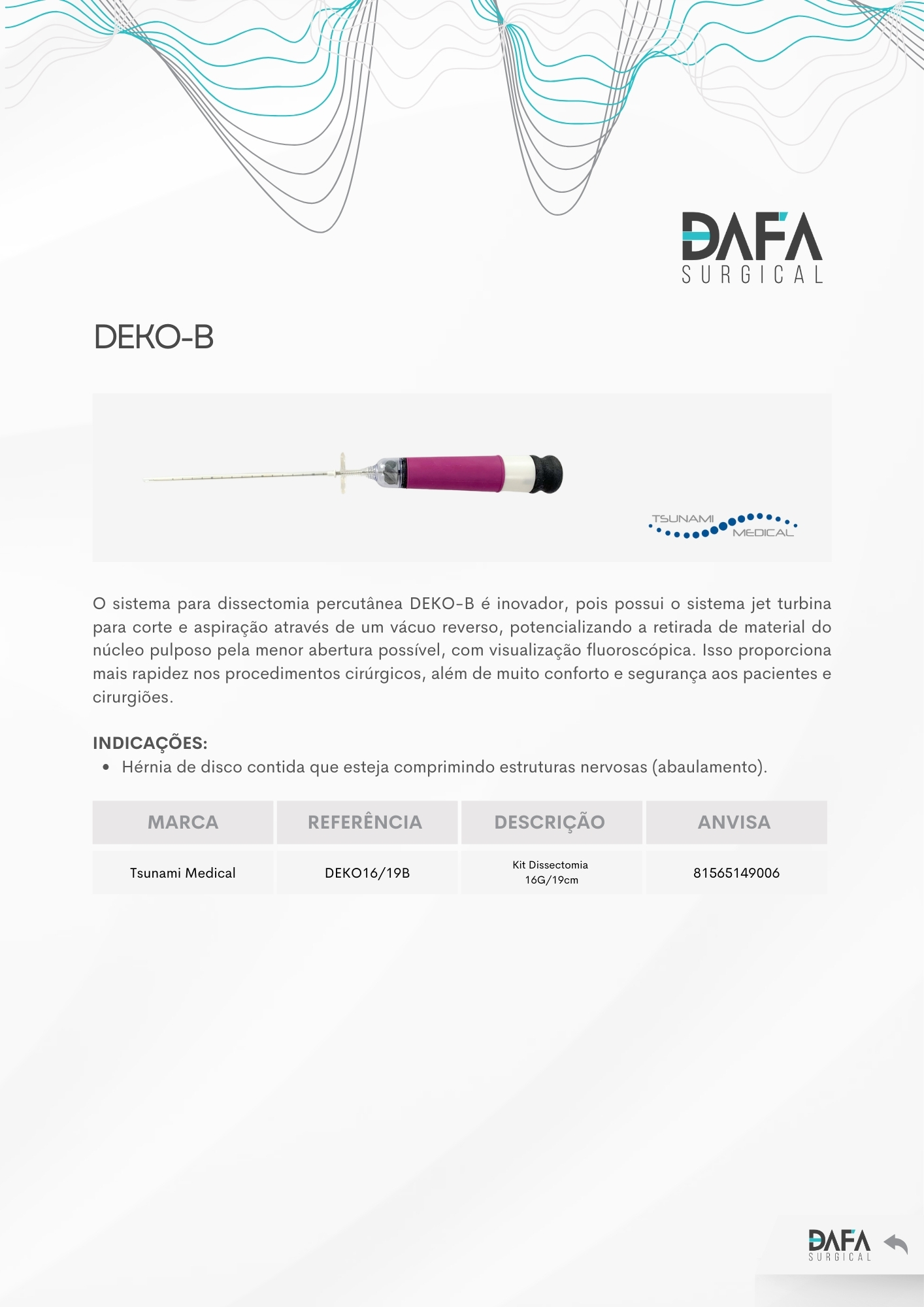 O sistema para discectomia percutânea DEKO-B é inovador, pois possui o sistema jet turbina para corte e aspiração através de um vácuo reverso, potencializando a retirada de material do núcleo pulposo pela menor abertura possível, com visualização fluoroscópica. Isso proporciona