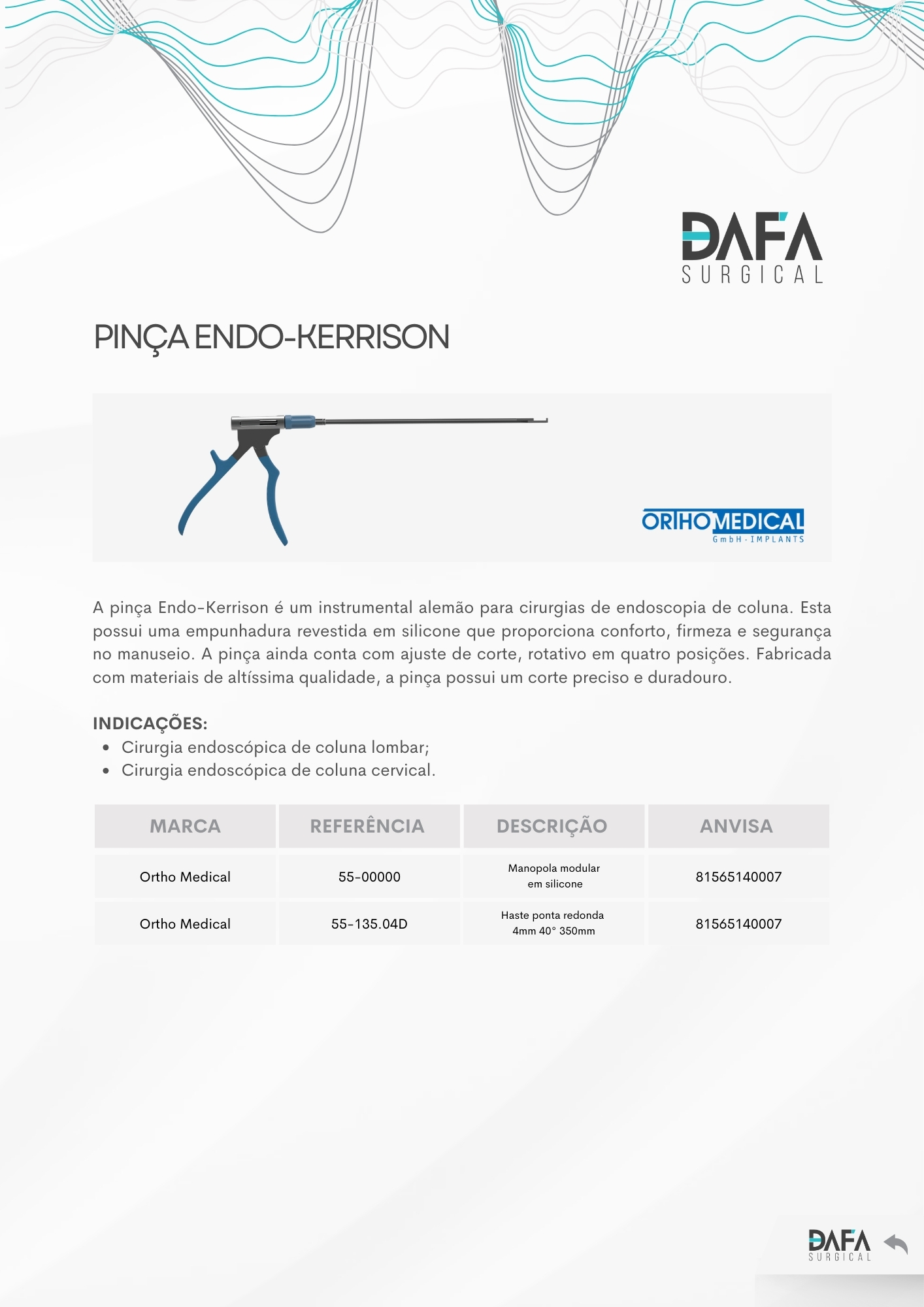A pinça Endo-Kerrison é um instrumental alemão para cirurgias de endoscopia de coluna. Esta possui uma empunhadura revestida em silicone que proporciona conforto, firmeza e segurança no manuseio. A pinça ainda conta com ajuste de corte, rotativo em quatro posições. Fabricada com materiais de altíssima qualidade, a pinça possui um corte preciso e duradouro.