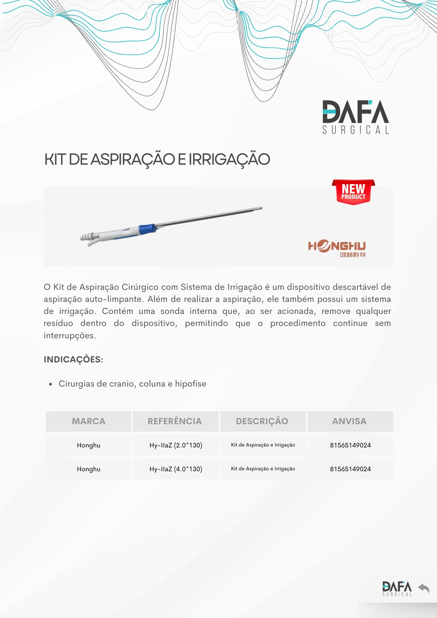 O Kit de Aspiração Cirúrgico com Sistema de Irrigação é um dispositivo descartável de aspiração auto-limpante. Além de realizar a aspiração, ele também possui um sistema de irrigação. Contém uma sonda interna que, ao ser acionada, remove qualquer resíduo dentro do dispositivo, permitindo que o procedimento continue sem interrupções.