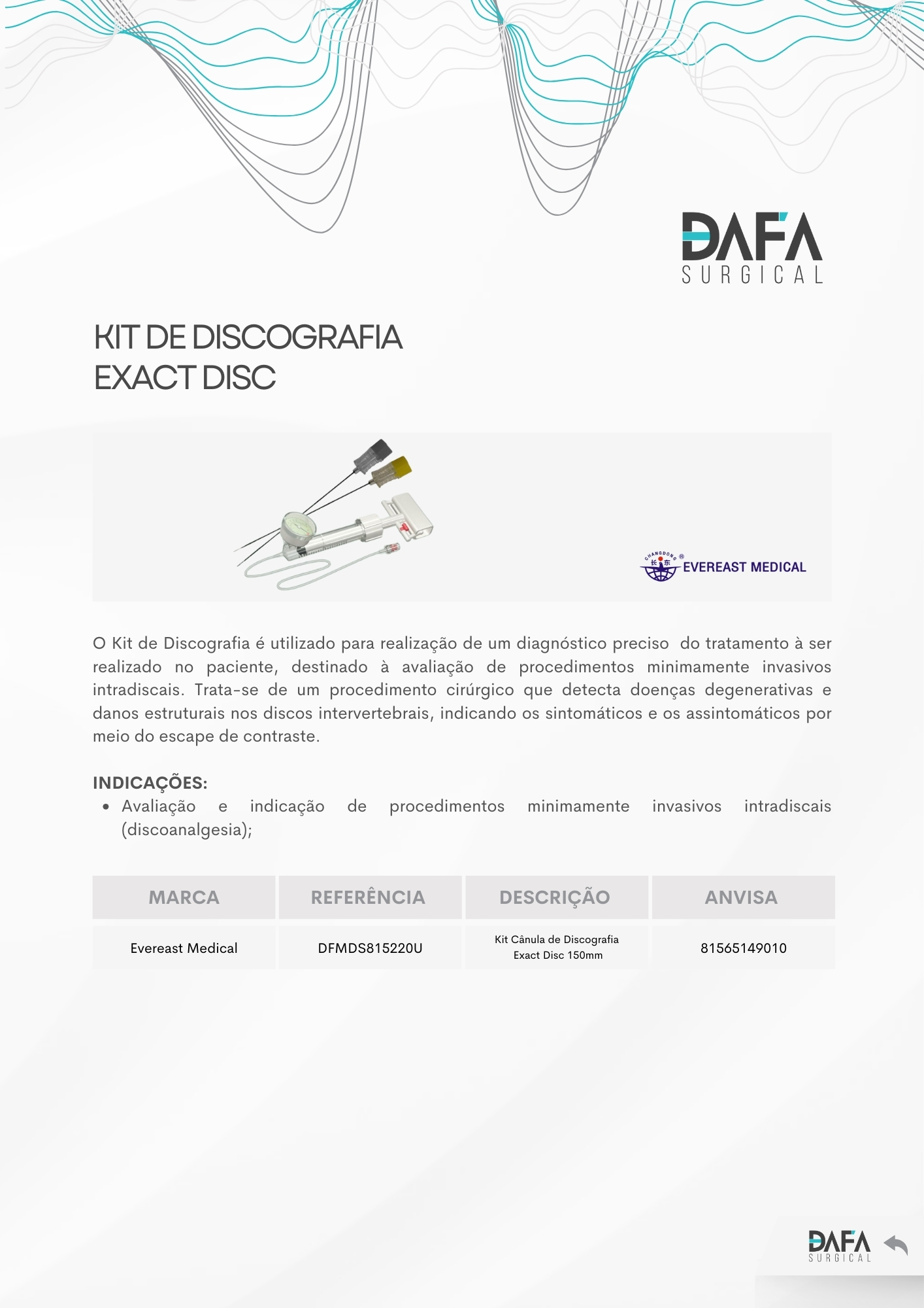 O Kit de Discografia é utilizado para realização de um diagnóstico preciso do tratamento à ser realizado no paciente, destinado à avaliação de procedimentos minimamente invasivos intradiscais. Trata-se de um procedimento cirúrgico que detecta doenças degenerativas e
