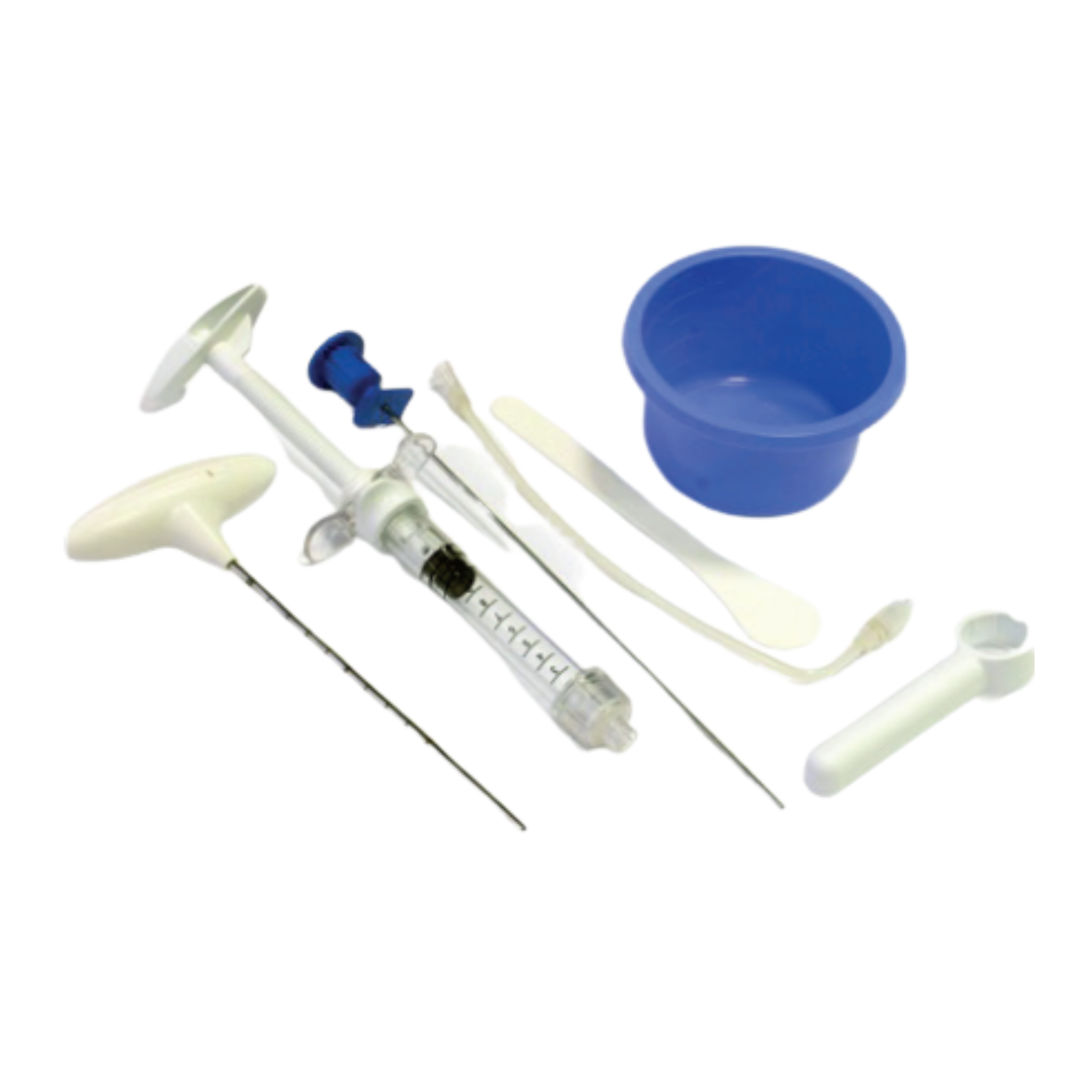 O Kit de Vertebroplastia é composto por 01 cânula de vertebroplastia, 01 agulha para biópsia histológica, 01 seringa com rosca de alta pressão, 01 tubo de conexão de alta pressão, 01 cuba, 01 espátula plástica para a preparação do cimento e 01 conector com sistema luer lock para aspiração de cimento.