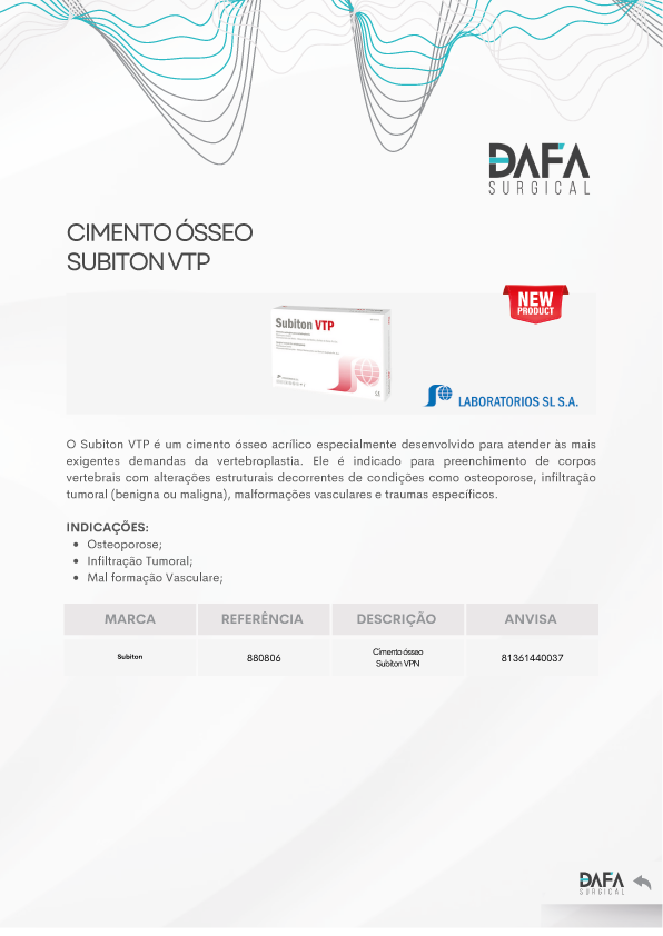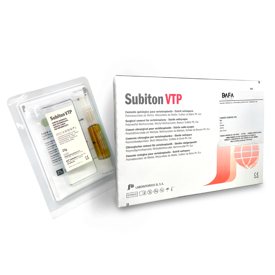 O Subiton VTP é um cimento ósseo acrílico especialmente desenvolvido para atender às mais exigentes demandas da vertebroplastia. Ele é indicado para preenchimento de corpos vertebrais com alterações estruturais decorrentes de condições como osteoporose, infiltração tumoral (benigna ou maligna), malformações vasculares e traumas específicos.