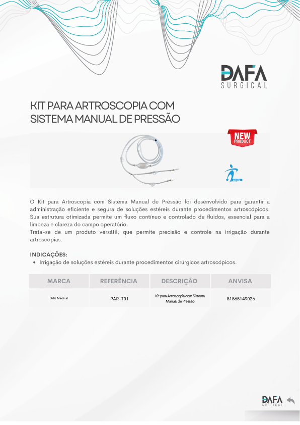 O Kit para Artroscopia com Sistema Manual de Pressão foi desenvolvido para garantir a administração eficiente e segura de soluções estéreis durante procedimentos artroscópicos.
