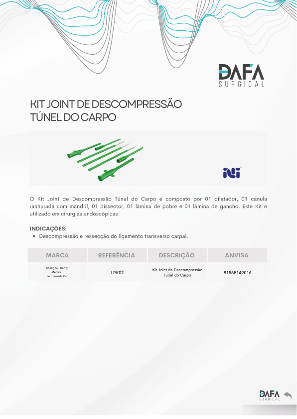 O Kit Joint de Descompressão Túnel do Carpo é composto por 01 dilatador, 01 cânula ranhurada com mandril, 01 dissector, 01 lâmina de probe e 01 lâmina de gancho. Este Kit é utilizado em cirurgias endoscópicas.